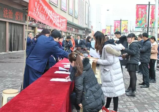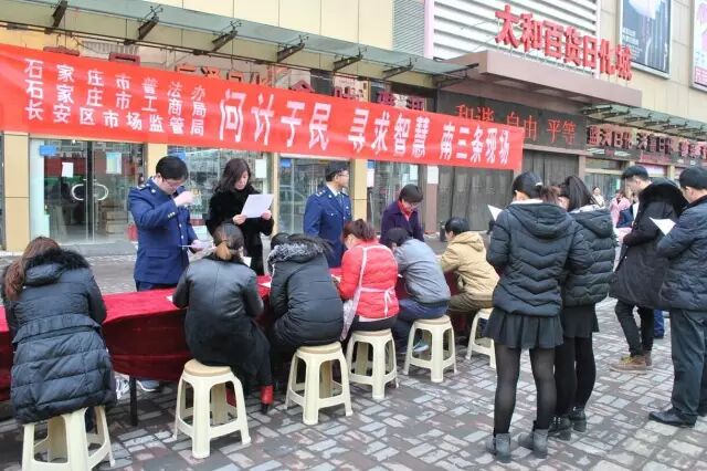 2017年2月22日下午,石家莊市司法局普法辦、石家莊市工商行政管理局、長安區市場監督管理局“雙問計——問計于民、尋求智慧”活動走進南三條太和百貨日化城,在商城東廣場開展了普法宣傳活動。