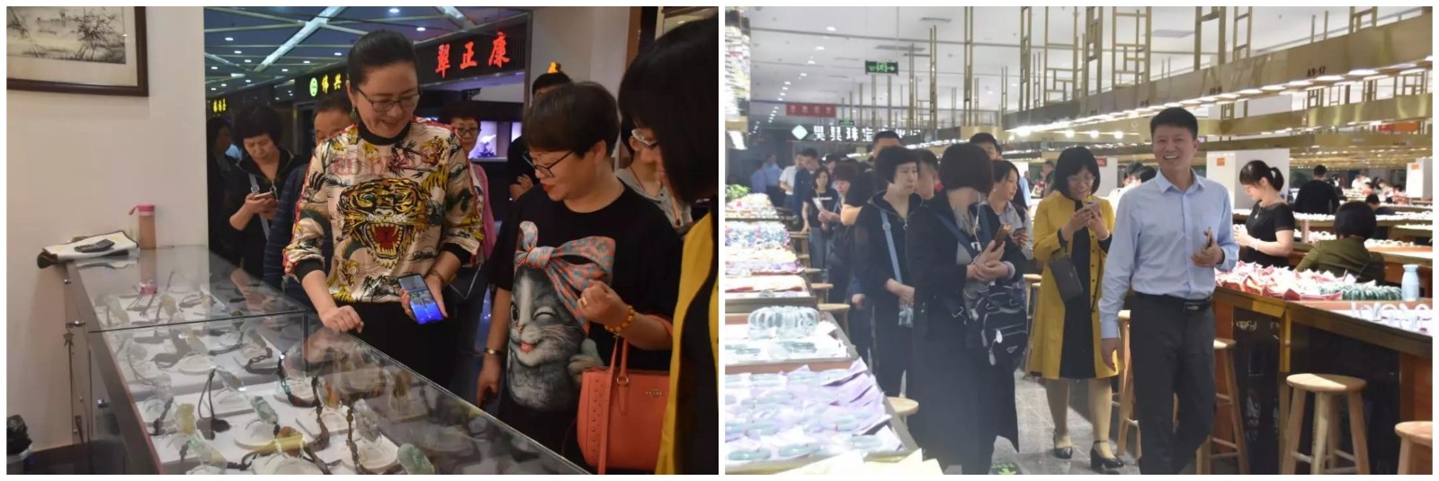 粵港澳之旅的第一站,觀光考察團一行人來到四會玉博城。玉博城是太和集團旗下的第六大商場,于2019年3月9日隆重開業??傆?7萬平米體量,吸納8000多家實力玉商入駐。從成品掛件、精美手鐲到精品擺件,四會玉博城精美翡翠飾品和絡繹不絕、穿梭如織的人流,讓考察團留下了深刻的印象。玉博城不僅有全品類精品翡翠,而且規模之宏大、硬件之全和極具性價比的翡翠制品都讓考察團贊嘆不已。