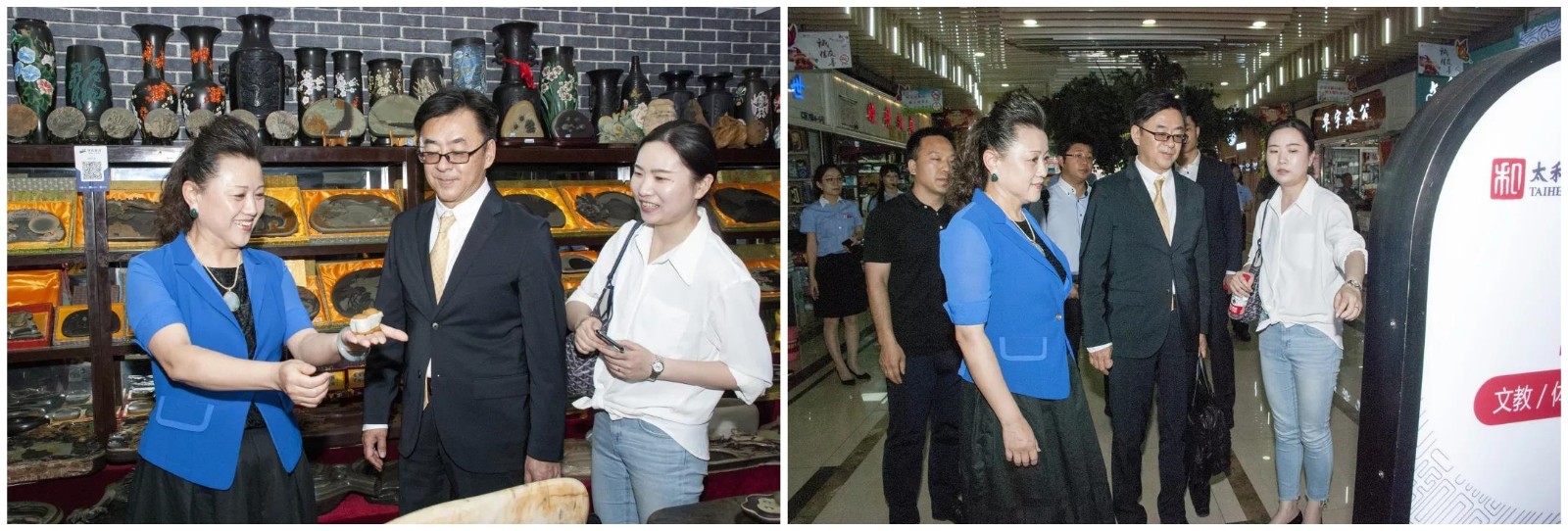 太和集團總裁兼太和電子城總經理李美璇,太和集團財務金融管理中心總監張素琴,太和集團地產運營中心總經理趙博超,太和集團副總經理、太和文化禮品城總經理陳暇,太和百貨日化城常務副總經理尚林,太和集團行政人力管理中心副總監孔華戈,太和電子城常務副總經理國朋軍等高層領導先后接待了考察團一行。
