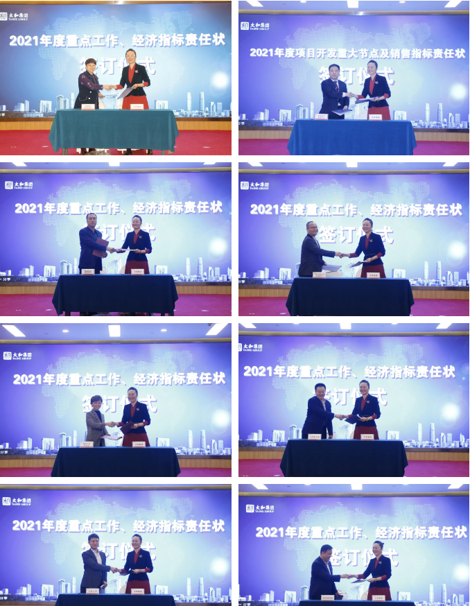 李總工作報告結束后,還舉辦了2021年度重點工作、經濟指標責任狀簽訂儀式。李美璇總裁與各企業負責人簽訂2021年度重點工作、經濟指標責任狀。李美璇總裁與各企業簽訂重點工作、經濟指標、項目開發重大節點及銷售指標責任狀