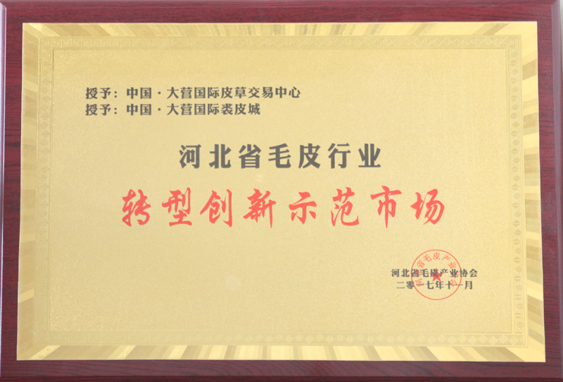 中國·大營國際皮草交易中心 中國·大營國際裘皮城 榮獲 河北省毛皮行業轉型創新示范市場