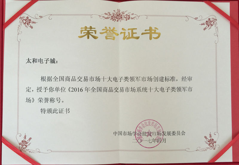 太和電子城榮獲 2016年全國商品交易市場系統十大電子類領軍市場